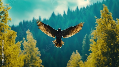 Fototapeta premium Silhouette of a bird in flight, soaring above a lush forest landscape.