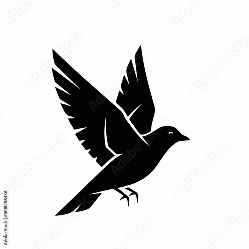 Fototapeta premium Silhouette of a bird in flight, wings spread wide, against a white background.