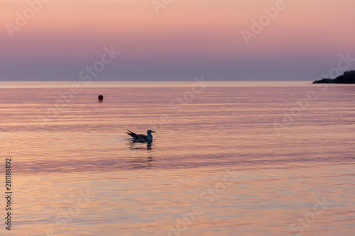 © Евгения Липинскас, Naklejka premium Silhouette of a bird on the background of the sea in the light of the early morning light of warm pink color