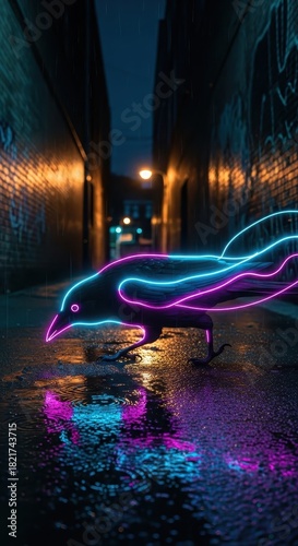 Fototapeta premium Silhouette of a bird outlined in bright neon light stands in a dark, wet urban alleyway