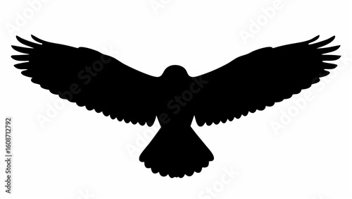 © usman, Naklejka premium Silhouette of a bird with wings spread wide in flight against a white background viewed from above angle