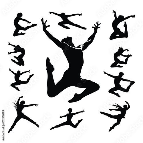 © DESIGN VIEW24, Obraz premium Silhouette of a black dancer leaping in mid-air vector set icon with white background