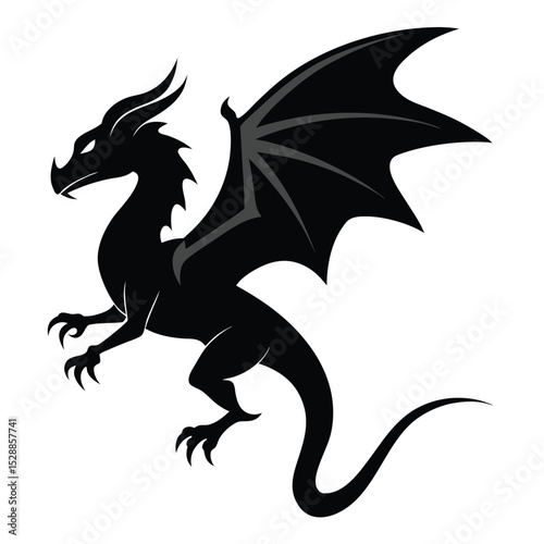 © sumit, Obraz premium Silhouette of a black dragon with wings on a white background