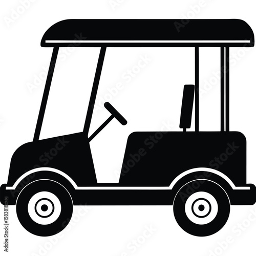 Fototapeta premium Silhouette of a black golf cart featuring roof, steering wheel, wheels, and seat
