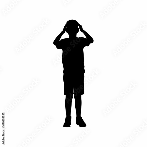 © KamrulHasan, Fototapeta premium Silhouette of a boy thinking with hands on head isolated on white background