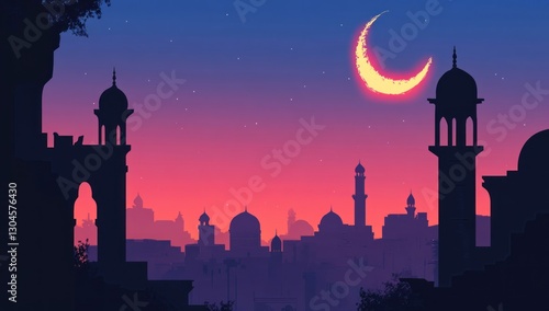 © malayeka, Fototapeta premium Silhouette of a city at sunset with crescent moon.
