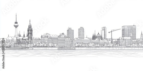 © Elena, Naklejka premium Silhouette of a city skyline against a horizon revealing iconic structures and modern buildings