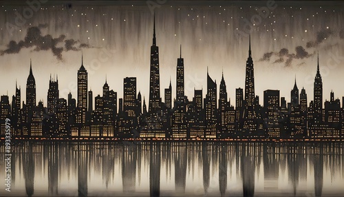 Obraz premium Silhouette of a city skyline at night with a reflection in the water, creating a captivating, serene visual effect, Generative AI.