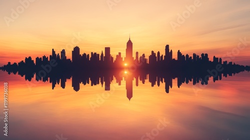 Fototapeta premium Silhouette of a city skyline reflected in calm water at sunset. Warm colors paint the sky as the sun sets behind the buildings.