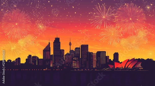 Fototapeta premium Silhouette of a city skyline with fireworks and glowing lights.