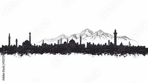 © Jojo*, Obraz premium Silhouette of a city skyline with mountains in the background.