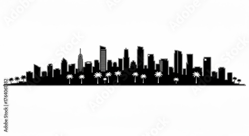 © HASSAN, Naklejka premium Silhouette of a city skyline with various buildings and palm trees in a black and white vector illustration