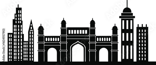 © Besticon25, Obraz premium Silhouette of a Cityscape with an Archway Building and Skyscrapers on White Background