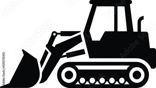 Naklejka premium Silhouette of a construction bulldozer, showing its bucket and tracks, in black and white.