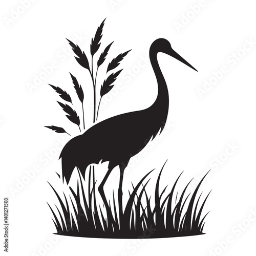 © Creative Image , Fototapeta premium Silhouette of a Crane Bird Standing in Grassy Marsh Illustration