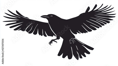 © 69 Timeless Studio , Obraz premium Silhouette of a crow mid-flight, dramatic pose with wings outstretched, deep black contrast on white background.