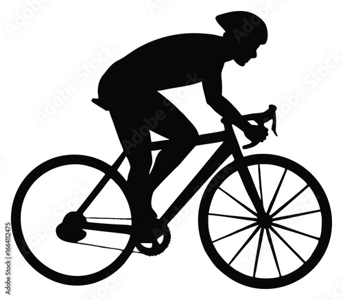 © vectorart092, Naklejka premium Silhouette of a cyclist riding a bicycle on a white background simple design