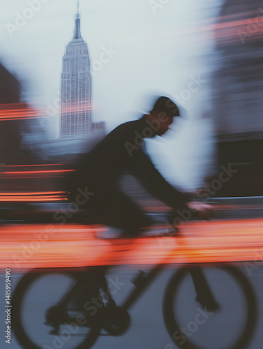 © udayanga, Obraz premium Silhouette of a cyclist riding through a city street with motion blur