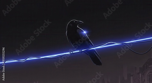 © Hungarian, Fototapeta premium Silhouette of a dark bird perched upon an energized glowing cable against a dim cityscape backdrop