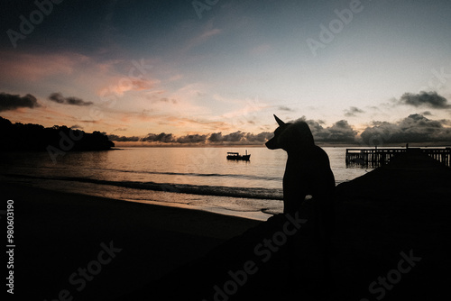 © Javier, Obraz premium Silhouette of a dog sitting on a pier bridge during sunrise on Koh Rong Island, Cambodia