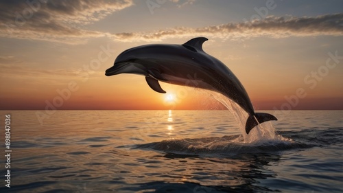 © THESUN, Obraz premium Silhouette of a dolphin jumping above the water during sunset.