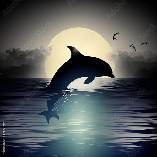 © AbdullahSefa, Obraz premium silhouette of a dolphin jumping out of the sea KI