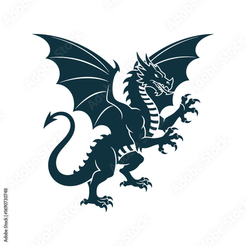 © GREEN, Naklejka premium Silhouette of a dragon with powerful wings spread, Vector Illustration.