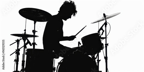Fototapeta premium Silhouette of a drummer performing passionately on a white background,...