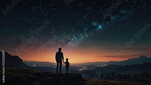 © Chaotic Fan, Fototapeta premium Silhouette of a Father and Son in the Mountains Watching the Stars and a Meteor Shower at Night