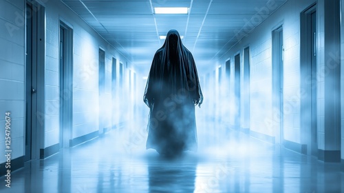 Fototapeta premium Silhouette of a figure in dark garment walking down a foggy hospital hallway,...