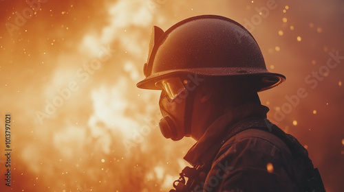 © Kingdola, Obraz premium Silhouette of a firefighter with a helmet, overlaid with swirling smoke and flames, symbolizing the fight against destruction