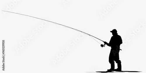 © xartproduction, Obraz premium Silhouette of a fisherman reeling in a fish against a white background during a quiet, serene fishing moment