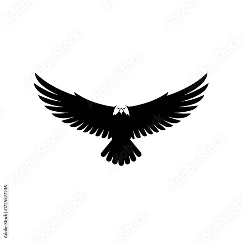 Obraz premium Silhouette of a flying eagle with wings spread wide, simple and bold, black on white, flat vector logo.