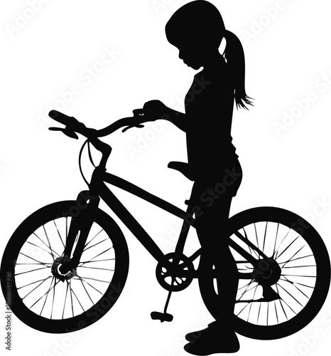 © Likhon, Obraz premium Silhouette Of A Girl Fixing A Bicycle