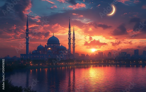 Fototapeta premium Silhouette of a Grand Mosque at Sunset with Crescent Moon