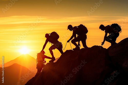 Obraz premium Silhouette of a group of climbers reaching the top, teamwork. Ai generated.