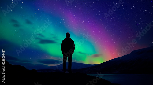 © Enrique, Fototapeta premium Silhouette of a guy with the beautiful colorful northern lights falling from the sky in Iceland in a stunning clear and nice lights with the sky full of stars. Aurora borealis. Travel concepts