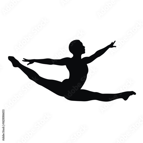 © GolamKibria, Obraz premium Silhouette of a gymnast performing a split leap isolated on white background, showcasing flexibility, balance, and artistic movement in gymnastics