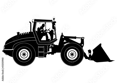 © norsob, Naklejka premium Silhouette of a heavy-duty wheeled loader with an operator. Vector.