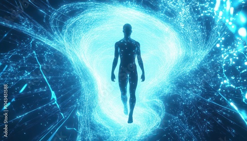 Obraz premium Silhouette of a Human Figure Walking Through a Blue, Swirling, Digital Vortex