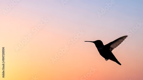 Naklejka premium Silhouette of a hummingbird in flight against a colorful sunset sky
