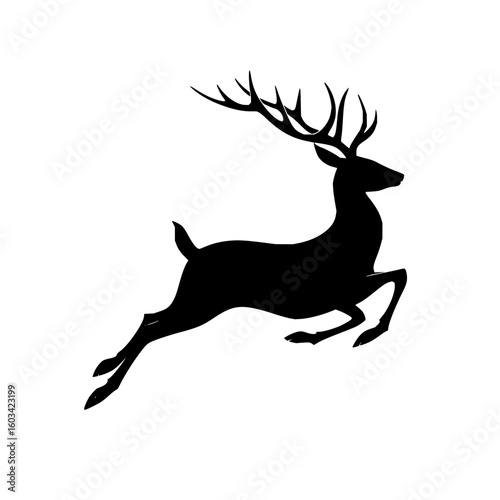 Fototapeta premium Silhouette of a leaping deer with large antlers against a white background in a simple graphic style