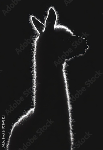 © zong, Naklejka premium Silhouette of a llama illuminated by backlight highlighting its fur texture against a dark background