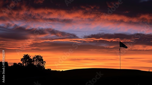 © sutinah, Fototapeta premium Silhouette of a lone golf flag against a dramatic sunset sky