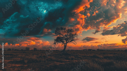 Obraz premium Silhouette of a Lone Tree Against a Dramatic Sunset and Starry Sky.
