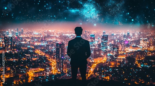 © Visioner, Fototapeta premium Silhouette of a man against a cityscape and starry night sky