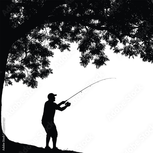 © Besticon25, Obraz premium Silhouette of a man fishing under a large tree with lush foliage nature