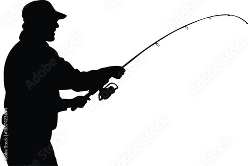 Fototapeta premium Silhouette of a man holding a fishing rod and casting a line, representing...