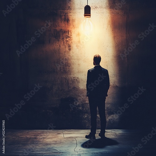 © KerXing, Obraz premium Silhouette of a Man in Contemplation Under a Dramatic Lightbulb's Glow