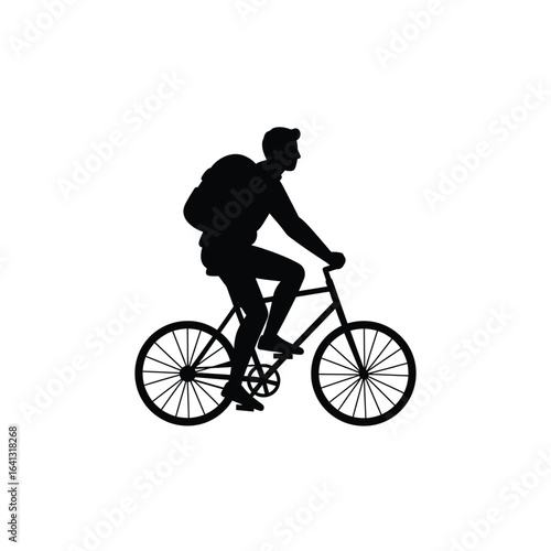 Fototapeta premium Silhouette of a man riding a bicycle with a backpack, isolated on white background